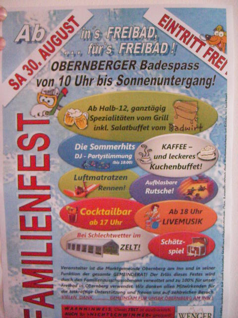 Der gesamte Gemeinderat der Marktgemeinde Obernberg am Inn veranstaltet am 30.8.2014 ein Badfest im Freibad nahe den Innauen. Man kann an diesem Tag von 10 bis 22 Uhr baden, Cocktails, Grillspezialitäten, Livemusik und vieles mehr genießen. Auf die Kinder wartet eine aufblasbare Riesenrutsche. Man kann bei einem Luftmatratzenrennen und einem Schätzspiel tolle Preise gewinnen. Der Hauptpreis ist ein Rundflug über das Innviertel. Der Reinerlös dieser Veranstaltung wird für eine Teilsanierung der Freibades verwendet.