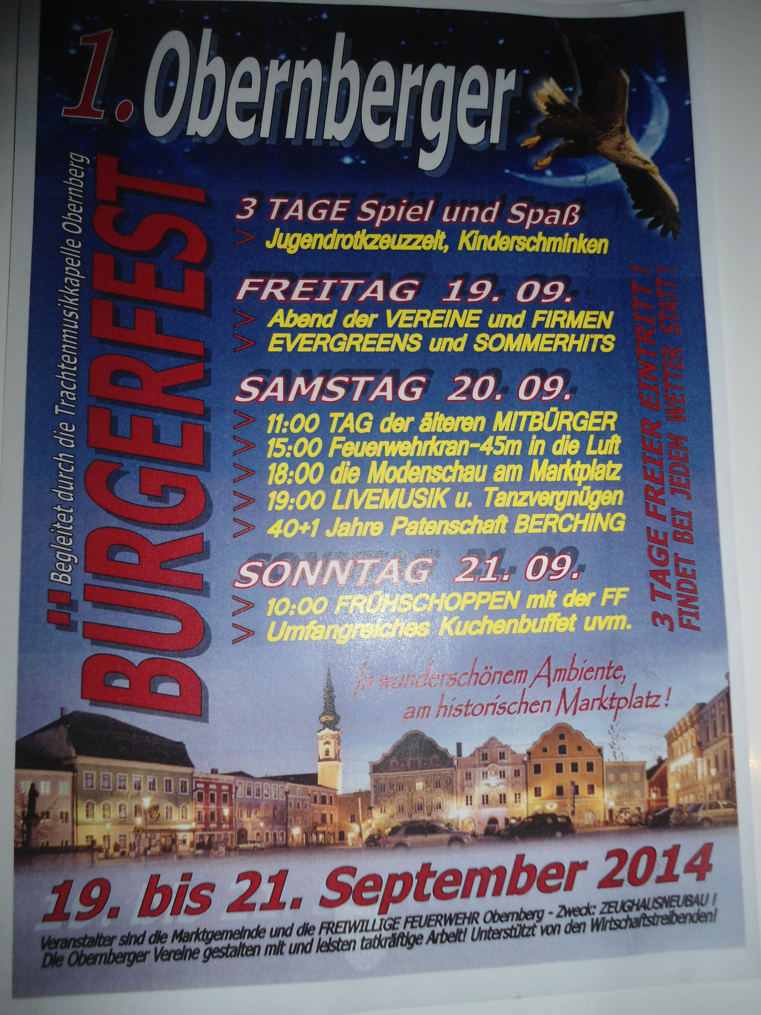 Im September findet vom 19.-21. das 1.Obernberger Bürgerfest statt und daher möchte die Marktgemeinde Obernberg am Inn gemeinsam mit der Feuerwehr alle recht herzlich dazu animieren, dem Fest einen Besuch abzustatten. Zahlreiche Vereine und Tourismusbetriebe werden dieses Fest kulinarisch bereichern.<b />